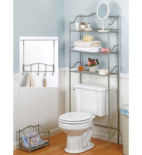 -. Feature : 3 Shelf Spacesaver / Magazine rack / Over-the-Door 5-Hook Rack / Beautiful Satin Nickel Finish / Decorate your entire bathroom