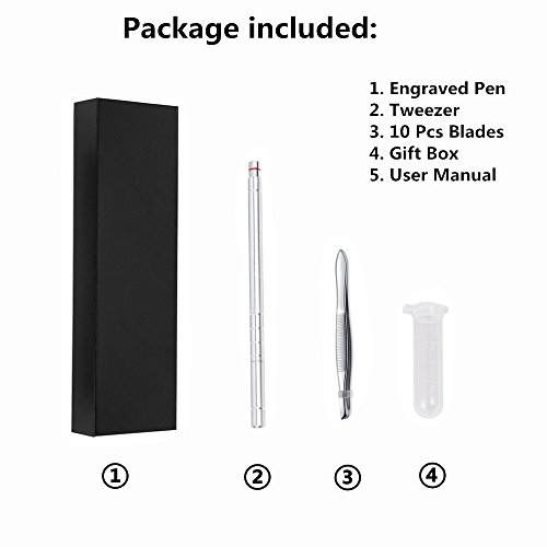- ☑ PACKAGE INCLUDED: 1 X Engraving Pen,10 X Blades, I X Tweezer, 1 X gift box, it can be used for a long time, Anti-slip handle, safe & convenient to use.