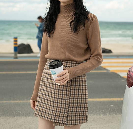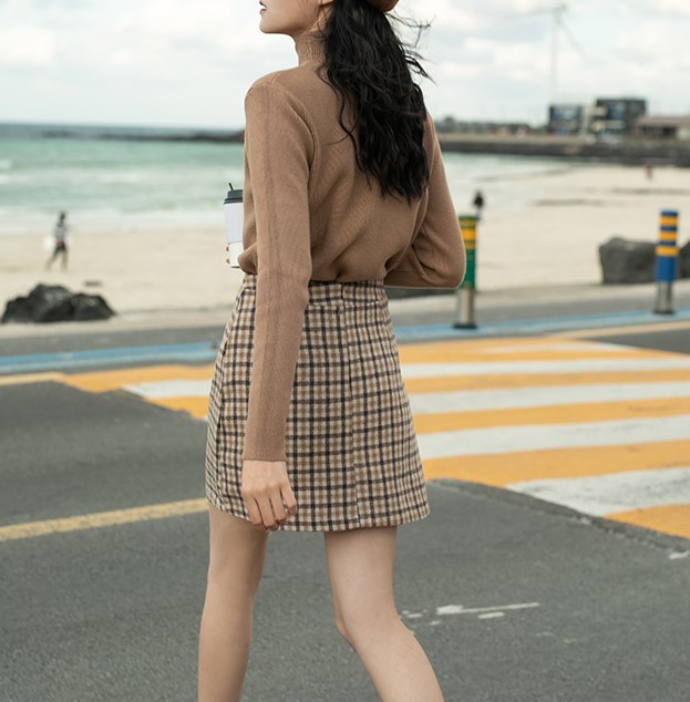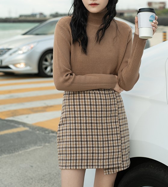 さりげないアシメカットのチェック柄タイトスカート。