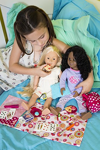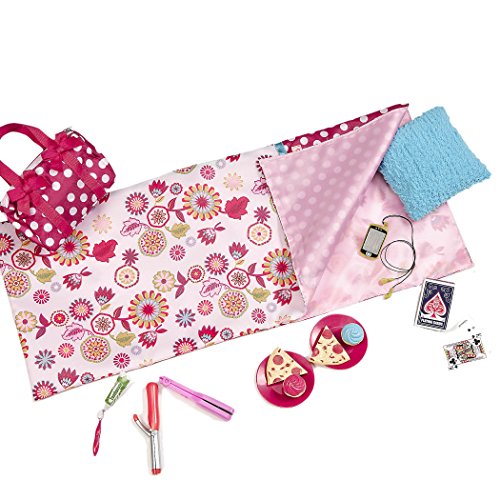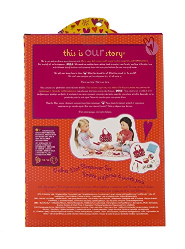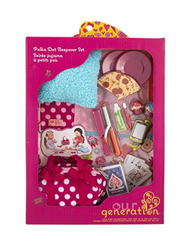 -. Feature : COMPLETE SLEEPOVER PLAY SET - Slumber parties aren't slumber parties without eating popcorn and cookies, watching movies late into the night, telling scary stories, and snling in our sleeping bags. This adorable set includes everything your dolls need for a night over at their best friend's house. Please note: dolls not included. / INCLUDES 16 PLAYABLE ACCESSORIES - The Our Generation Polka Dot Sleepover Set includes 1 sleeping bag, 1 overnight bag, 1 shaggy pillow, 1 straightening iron, 1 curling iron, 1 smart phone with headphones, 1 toothbrush, 1 toothpaste, 2 round dishes, 2 pizzas, 2 cupcakes, playing cards and playing card burst. / TRUSTED QUALITY - All our dolls, clothes, and accessories are made with safe, carefully-chosen, high-quality material. They're easy to clean and maintain and are shipped in eco-friendly packaging. They can be collected, cherished, and also recycled the old fashioned way (by being passed on). For more information see our website. / OUR GENERATION MISSION - We're dedicated to a new, multifaceted generation of girls who are playing hockey, getting involved in charities, dressing fashion-forward, and still finding time to, you know, be kids! Our Generation is much bigger than an 18" doll. It's about an extraordinary generation of girls growing up, learning, playing, and changing the world together. / FULLY COMPATIBLE WITH MOST 18" DOLLS - All Our Generation dolls, clothes, and accessories are fully compatible with most 18" dolls, including American Girl dolls and accessories. These products can be mixed and matched interchangeably without noticeable difference.