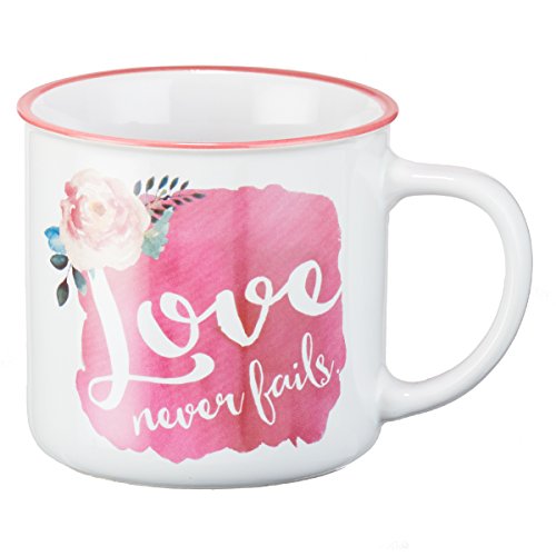 Featuring a colorful design, this Christian mug displays the ''Love Never Fails'' quote