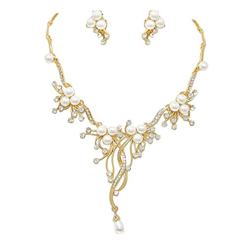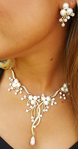-. Binding : Jewelry -. Brand : Rosemarie Collections -. Color : Gold Color -. Department : womens -. Feature : Gold tone statement necklace and drop earrings set with a pretty floral design / Collar necklace 16" length with 2.5" extension, decor 2.5" length / Matching pearl stud earring; 1" length / Featuring clusters of cream colored faux pearls and sparkling crystal rhinestones / Beautiful bridal jewelry set is also great for prom, special occasions or evenings out -. Label : Rosemarie Collections -. Manufacturer : Rosemarie Collections -. Model : WT-1424-40XX -. MPN : WT-1424-40XX -. PartNumber : WT-1424-40XX -. ProductGroup : Jewelry -. ProductTypeName : FASHIONNECKLACEBRACELETANKLET -. Publisher : Rosemarie Collections -. Studio : Rosemarie Collections -. Title : Rosemarie Collections Women's Vintage Style Flower Faux Pearl and Rhinestone Jewelry Set
