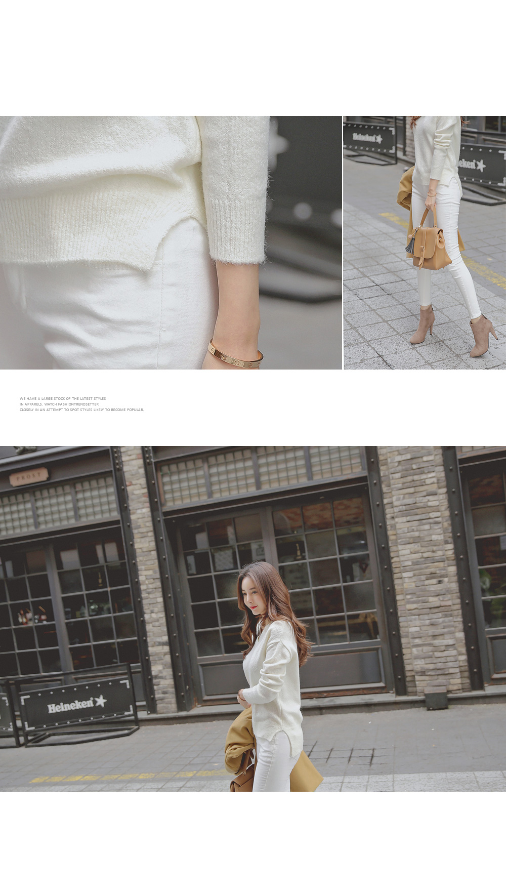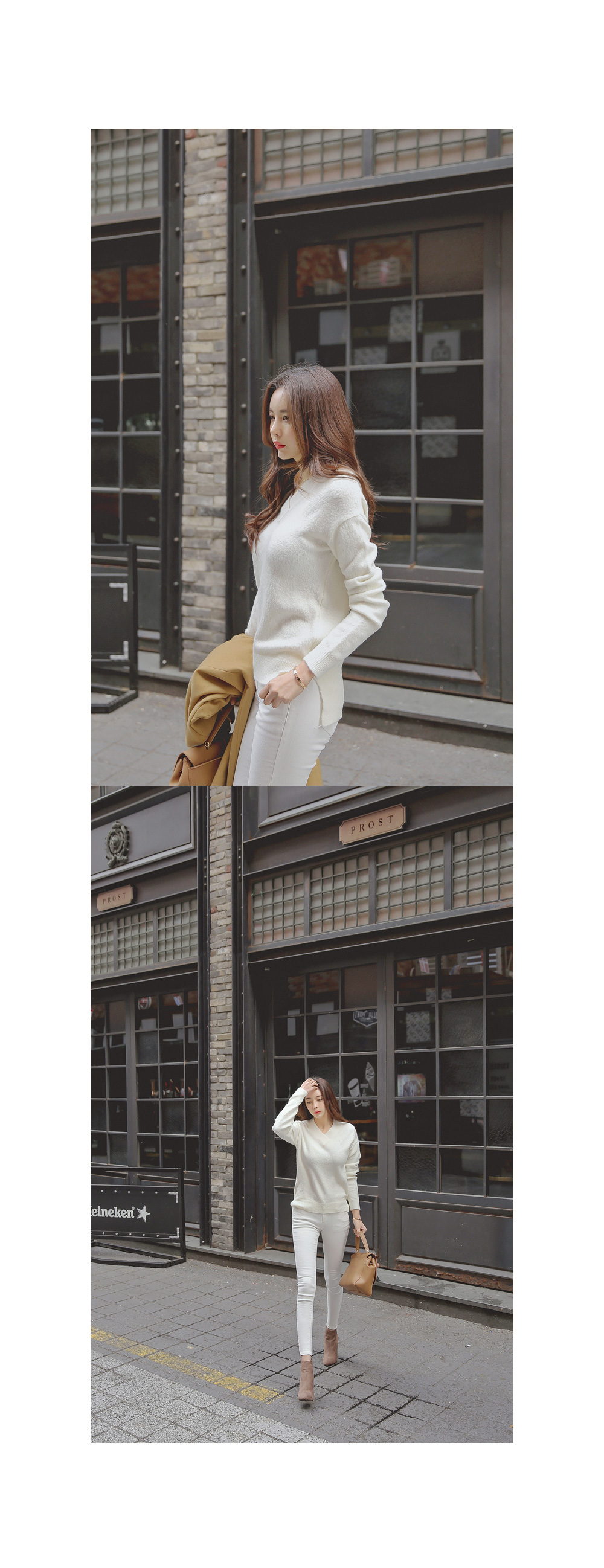 적당히 여유 있는 핏으로 제작되어 편안한 착용감을 자랑하며 앞 기장이 살짝 더 짧은 언발란스한 기장으로 입었을때 더욱 매력적인 니트 아이템이에요. 옆 트임 디테일이 더해져 더욱 멋스러워요.