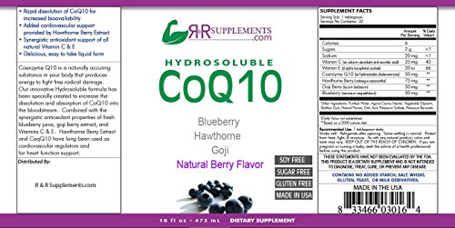 Benefits of CoQ10 Liquid Supplements Our proprietary CoQ10 liquid supplement formula is a delicious, easy-to-use liquid form of Coenzyme Q10, which is a naturally-occurring enzyme in your body, producing the needed energy to fight off free radical damage. Our innovative Hydrosoluble formulation has been specifically designed to increase the function and absorption of CoQ10 into the bloodstream. Our formula includes the synergistic antioxidant properties of fresh blueberry juice, goji berry extract, vitamin C and vitamin E. Hawthorne Berry Extract and CoqQ10 have long reported to have been used as cardiovascular regulators and for heart function support.. Hydrosoluble CoQ10 delivers: • Rapid 100% dissolution of CoQ10 for increased bio-availability • Added cardiovascular support provided by Hawthorne Berry Extract • Synergistic antioxidant support of all-natural Vitamin C & E