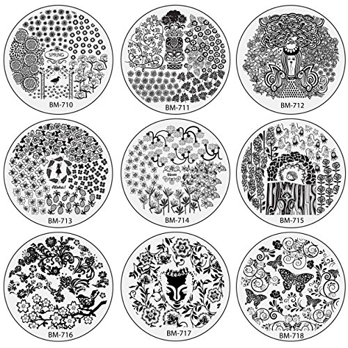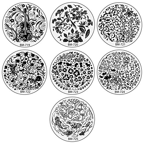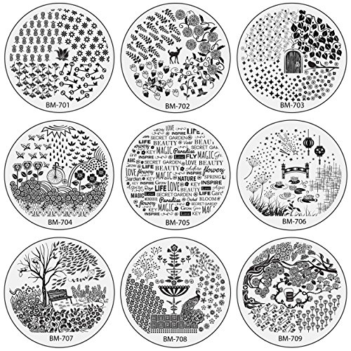 Runaway to a Secret Garden with this magical nail stamping set! Bundle Monster is happy to introduce our newest 2015 buffet style collection! Each plate has beautiful borderless stamped imagery of everything from gorgeous detailed vines, fruits, trees to delicate florals and butterflies. Each buffet design is unique, created in-house and used exclusively by Bundle Monster. The new borderless style allows for nails of all sizes, forget worrying about trying to fit the rectangular stamp to your nail bed with the buffet format! Each package contains 25 stainless steel plates measuring 5.5 cm in diameter and each are topped with 5-9 various designs. The scraper and stamper are NOT included. These nail plates are easy to use, allowing you to quickly create a wide range of nail designs! The nail stamping process only takes a few minutes. *APPLICATION*: Apply any color nail polish to your chosen image on the stainless steel plate. Using a scraper, remove any excess nail polish. Using a stamper, stamp the image in a rolling motion. Stamp the design directly to the nail. Not only are our nail stamping plates easy to use, but your design can be changed as easily as a coat of nail polish! **NOTE**: Before use, peel off the tight, protective, blue plastic on top of each plate. *DISCLAIMERS*: Due to differences between monitor displays, actual color may vary slightly from image. b.m.c is a registered trademark of Remi Collections LLC and is exclusively distributed by Bundle Monster. The b.m.c trademark is protected by US Trademark Law.Feature