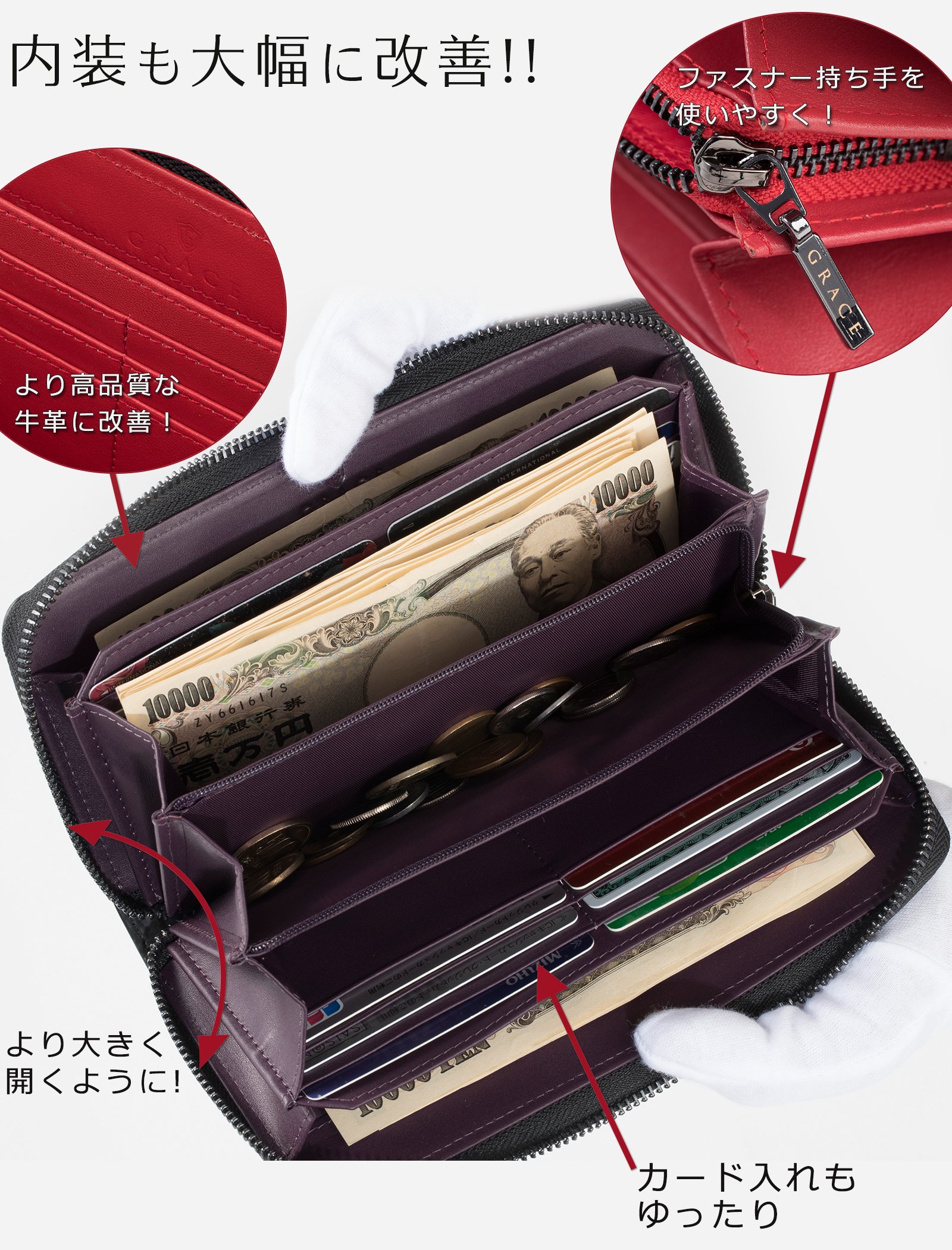 By making the coin purse in an L shape, it opens widely, making it easier to put in and out of small change.