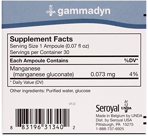 -. Binding : Health and Beauty -. Brand : Unda -. EAN : 0754748041589 -. Feature : Furnishing the body with ions indispensable for cellular enzymatic functions and maintaining optimal health. / 30 unidoses -. IsAdultProduct : 0 -. Label : Seroyal -. LegalDisclaimer : * These statements have not been evaluated by the Food & Drug Administration. These products are not intended to diagnose, treat, cure or prevent any disease. Please contact your healthcare professional immediately if you experience any unwanted side effects. The information contained herein is for informational purposes only and does not establish a doctor-patient relationship. Please be sure to consult your physician before taking this or any other product. -. Manufacturer : Seroyal -. MPN : 17140 -. PackageQuantity : 1 -. PartNumber : 17140 -. ProductGroup : Health and Beauty -. ProductTypeName : HEALTH_PERSONAL_CARE -. Publisher : Seroyal -. Studio : Seroyal -. Title : UNDA - GAMMADYN Mn - Manganese Oligo-Element Supplement - 30 Ampoules -. UPC : 754748041589