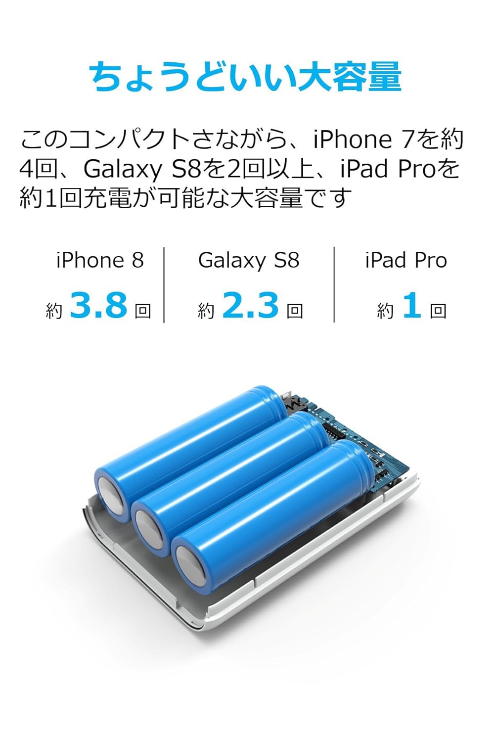 コンパクトで大容量:iPad Airに約1回、Galaxy S8に約2回半、iPhone 8に約4回、その他ほとんどのスマートフォンに複数回の充電が可能です。(安全かつ高速にお使いいただくために、2A出力のアダプタでモバイルバッテリー本体を充電を推奨します)。