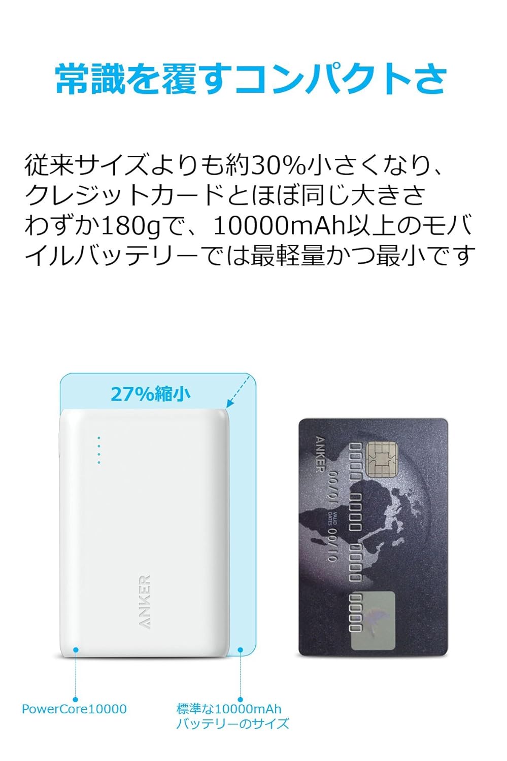 【※ご注意:Anker製品はAnkerDirectのみが正規販売店ですのでご注意ください】世界最小&最軽量:10000mAh以上のモバイルバッテリーでは、世界最小&最軽量(※2018年8月時点)。10000mAhの大容量ながら、ポケットにも収まるほどコンパクトで、卵3つ分ほどの重さしかありません(約180g)。