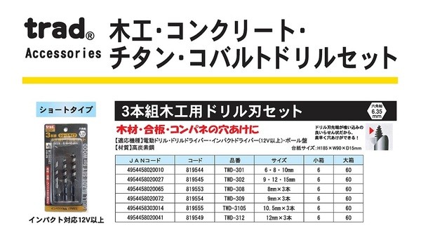 【商品名】(業務用10セット) TRAD 木工用ドリル刃セット 【9/12/15mm 3本組】 ショートタイプ インパクト対応12V以上 TWD-302