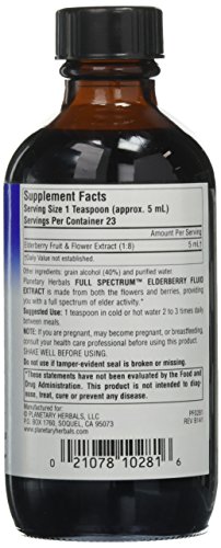 -. Binding : Health and Beauty -. Brand : Planetary Herbals -. EAN : 0021078102816 -. Feature : Elder berries and flowers have been used worldwide to support healthy immunity / Potent combination of the berries and flowers of the black elder tree (sambucus nigra) / Designed to support the body's defense system when under physical stress -. IsAdultProduct : 0 -. Label : Planetary Herbals -. LegalDisclaimer : * These statements have not been evaluated by the Food and Drug Administration. This product is not intended to diagnose, treat, cure or prevent any disease. ** Always refer to the manufacturer's label on the product for description, recommended dose and precautions. -. Manufacturer : Planetary Herbals -. Model : GP1617 -. MPN : GP1617 -. NumberOfItems : 1 -. PackageQuantity : 1 -. PartNumber : GP1617 -. ProductGroup : Health and Beauty -. ProductTypeName : HEALTH_PERSONAL_CARE -. PublicationDate : 2013-08-20 -. Publisher : Planetary Herbals -. ReleaseDate : 2013-08-17 -. Size : 4 oz -. Studio : Planetary Herbals -. Title : Planetary Herbals Full Spectrum Elderberry Fluid Extract Supplement, 4 Fluid Ounce -. UPC : 021078102816