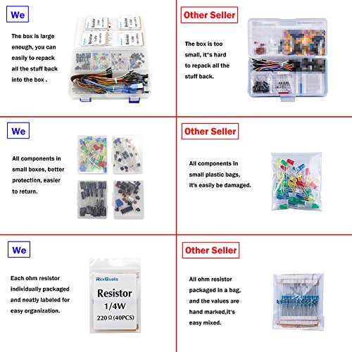 GREAT QUALITY AND BIG BOX PACKING.Resistors/LED/Transistors and Integrated Circuits are individually packaged and labeled, and packing in a plastic box which is bigger enough for you.