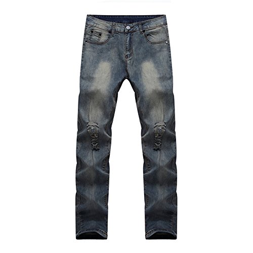 -. Feature : Material: Denim / Type: frayed denim men jeans, different size for choice. Traditional 5-pocket styling.Zip-Fly with button closure. / Hand-wash and Machine washable, Dry Clean. / Using environmentally friendly dyeing that is no harm to the health. Note: First washing, please separate from light-colored clothes. You can soak and add two tablespoons of white vinegar and a little salt to do some color retention process for about half an hour. Then rinse with water and reverse side hang dry, do not be exposed to the sun. / Notice: Amazon standard size chart is not our actual size .Please check on product image and choose the right size before you place an order.