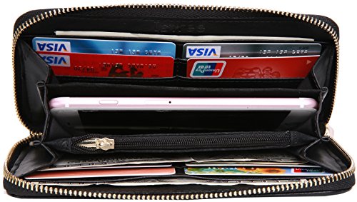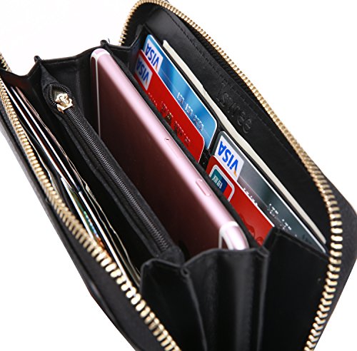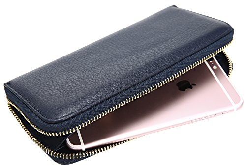-. Feature : Iswee technology make sure no one will get your personal information through our RFID protection. / Our wallet can block RFID signals from ID card, credit card, driver license and passport. Works as a frequency of 13.56 MHz / Our wallet can NOT block RFID signals from ID badge, some old hotel room cards, some building access cards, which works as a frequency of 125 MHz / 5 Full long pockets, 8 Card slots, 1 Interlayer zipper pocket for your money or coins. Fit your Iphone6 plus. Come with wristlet strap, easy to take with. / Size info-(L)7.8 x (H)3.71 x (W)0.97" in and the weight is about 0.48 pounds.