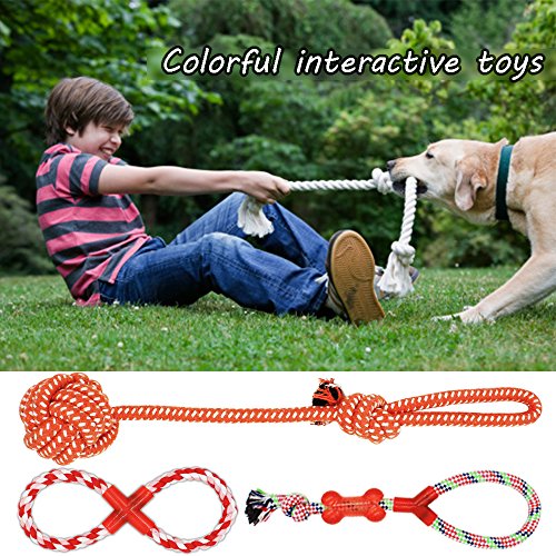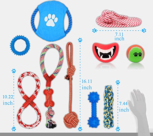 Specification: Contains Assorted 10 dog toys.(Interactive toys,chew toys,ropes toys,squeaky toys,frisbee toys,dog toy balls) Material: Made up harmless and resistance to bite material, it will be reliable and make your pet happy. Interaction: You can use these toys accompany with your pets to play games and bringing you closer together. Dental care: It can be able to clean dirt in teeth when pets playing, keep teeth clean and it will decrease disease to pets. Give you a clean and safe family: When you are not at home, use then to attract your pets'attention and you don't worry they will destroy your sofa!