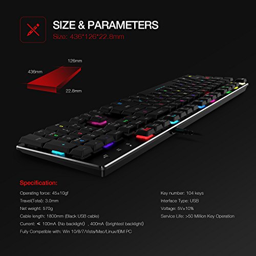 ★ Standard 104 Keys with numeric keys, Ultra-thin and Light, Compact Design, 17.2"* 5"* 0.89", 570g only, thinner and lighter than traditional mechanical keyboard.