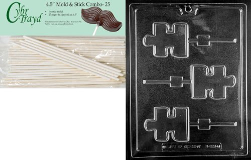 Cybrtrayd 45St25-M223 Puzzle Piece Lolly Autism Award Miscellaneous Chocolate Candy Mold with 25-Pack 4.5-Inch Lollipop Sticks