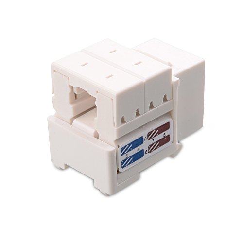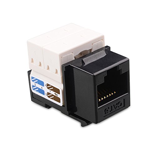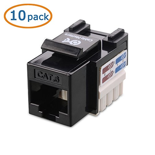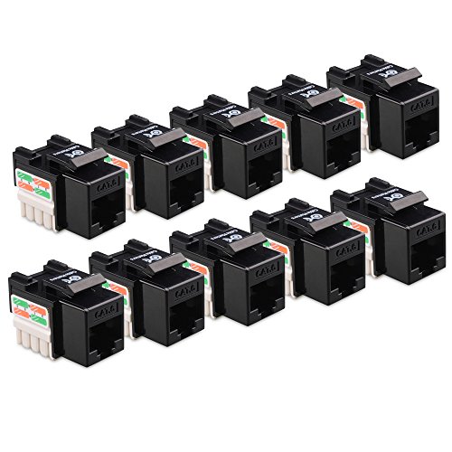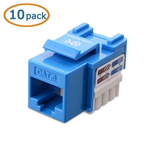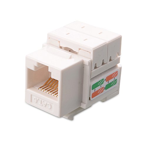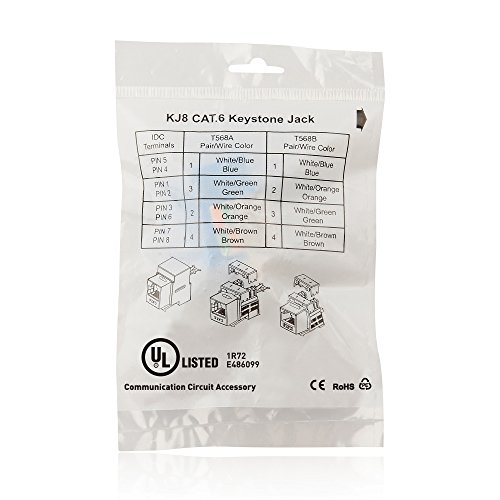 [Description] CAT 6 RJ45 heavy duty keystone jacks fit patch panels_ wall plates_ or surface mount boxes with standard keystone blank openings; Accepts 23 and 24 AWG unshielded twisted pair (UTP) cable 10 GIGABIT ETHERNET Cat 6 performance to future-proof your network; Backwards compatible to 10/100 Ethernet; Meets or exceeds Category 6 performance in compliance with the ANSI/TIA/EIA 568-C.2 standard UL LISTED keystone jack (E486099) with T568A and T568B color-coded labels; Category 6 rated performance up to Gigabit Ethernet speeds for a fast and reliable network; Supports T568A and T568B wiring with 110-style_ color-coded termination blocks; Dual IDC terminals accept 110 or Krone impact tools and provide cable strain relief COST-EFFECTIVE 10-PACK of Category 6 KJ modules includes a keystone jack punch-down stand for easier and safer cable termination; Impact tool or tool-free 90 degree termination HEAVY-DUTY CONSTRUCTION includes an impact- resistant and fire-retardant housing with gold-plated RJ45 contacts_ dual IDC covers_ and a snap-in retaining clip for a secure connection