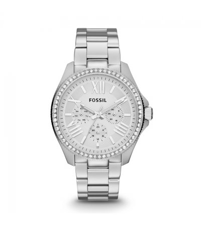 Fossil Cecile Silver Dial Stainless Steel Ladies Watch AM4481. 40 mm silver tone stainless steel case with a crystal-studded bezel, a silver dial, a mineral crystal, and silver tone luminescent hands. Hour markers: alternating index and Roman numerals in silver tone. Minute markers around the rim. Logo beneath the 12 o'clock position. Multifunction feature with 3 subdials: day of the week, date, and 24-hour time. Hands: hours, minutes, and seconds. Case thickness of 12 mm. Push / pull crown. 20 mm silver tone stainless steel bracelet with a deployment clasp. Quartz movement and water resistant up to 100 meters. Style: casual watches. Cecile series.Feature