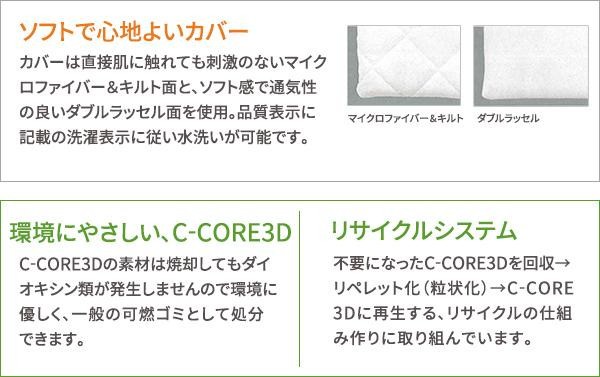 | 中材に使用しているC-CORE3Dは適度な反発力があり、体圧分散性に優れています。C-CORE3Dは繊維が網状に絡み合った構造をしているため、通気性に優れ、湿気がこもることがありません。カバーは直接肌に触れても刺激のないマイクロファイバー&キルト面とソフトで通気性の良いダブルラッセル面がありますので、シーズンに合わせてお使いいただけます。日本アトピー協会推薦品。空気が循環しやすく患部を衛生的に保てます。 |