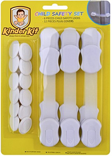 CHILD SAFETY LOCKS BY KINDER KIT - PACK OF 6 SAFETY LATCHES & 12 OUTLET COVERS - NO TOOLS - ADJUSTABLE SIZE - ADHESIVE FURNITURE LATCHES FOR FURNITURE TOILET SEAILLINT&MORE