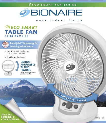 This table fan disperses invigorating, revitalizing coolness for maximum comfort and freshness. Lifeless air dissipates to breaths of nourishing air and the renewing effects of cooler air become more present in your surroundings. Designed with Pure Quiet technology for soothing white noise and Eco-Smart energy consumption. With Bionaire brand technology, you can live in harmony with nature for a serene home environment.Feature