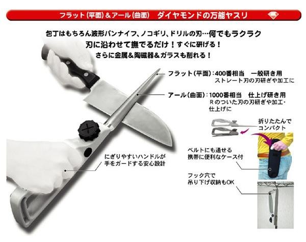 平面&曲面の両面使いできるやすりはダイヤモンドを使用しており、様々な刃物類をどなたでも簡単に、短時間で研げます。滑っても手などを怪我しない安全設計のグリップで女性にも嬉しい!!使わないときは、ダイヤモンドやすりをハンドル部分に折り込めてコンパクトになります。 |