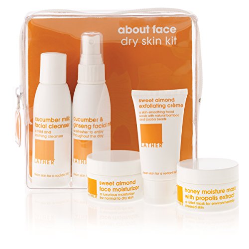 A perfect introduction to LATHER skin care, this travel-friendly kit contains everything needed to gently cleanse, hydrate, nourish and create glowing skin. Best for normal to dry skin types. Set includes: 2 oz. cucumber milk facial cleanser, 2 oz. cucumber & ginseng facial mist, 1 oz. sweet almond exfoliating crème, 0.5 oz. sweet almond face moisturizer, 0.5 oz. honey moisture mask, licorice root eye treatment sample pack.Feature