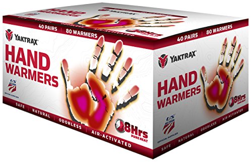 Binding : Sports Product Description Yaktrax Disposable Hand Warmers are a superior source of natural heat that keep hands warm when the temperature gets cold. Once opened, these odorless and environmentally-safe warmers begin working within minutes, providing up to 8 hours of steady warmth. Yaktrax Hand Warmers contain natural ingredients including iron powder, water, salt, activated charcoal, and vermiculite. Yaktrax Warmers are ideal for keeping warm when camping, hunting, fishing, skiing, athletic events, and more. Dimensions per warmer: 3.5 x 5 x 0.25 inches. 0