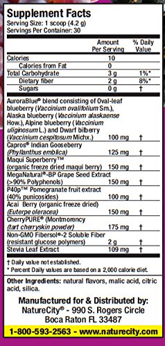 Features: AuroraBlueTM Blueberry, P40p® Pomegranate, MegaNatural®-BP Grape Seed, CherryPureTM Tart Cherry, Capros® Amla, Maqui SuperBerryTM and Organic Acai Berry