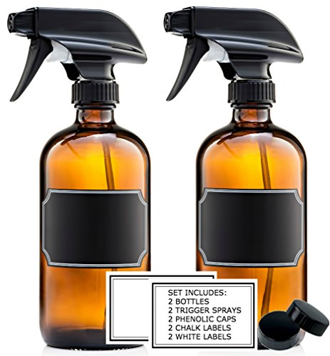 16 Oz. Amber Glass Trigger Spray Bottles Refillable Set of 2 with Phenolic Caps, Chalk Stickers & White Labels