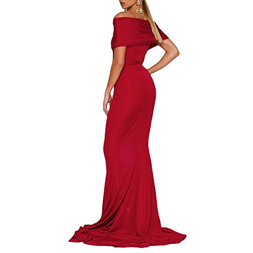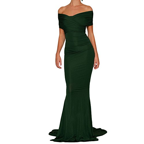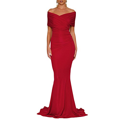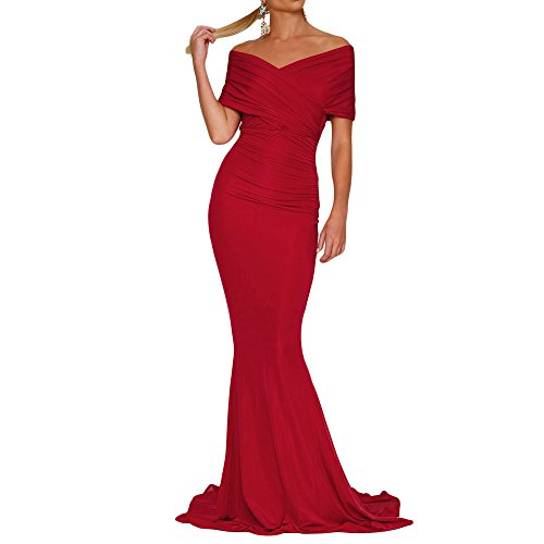 Off-shoulder Mermaid Wedding Party Gown is elegant and sophisticated with its bold chic bare shoulder design. Rushed detailing along bust and hips. Long mermaid train. Invisible back zipper at the centre back. For a show-stopping look on the wedding party or other social event, we recommend statement earrings and sleek hair or go all glam with big curls and gold jewellery.