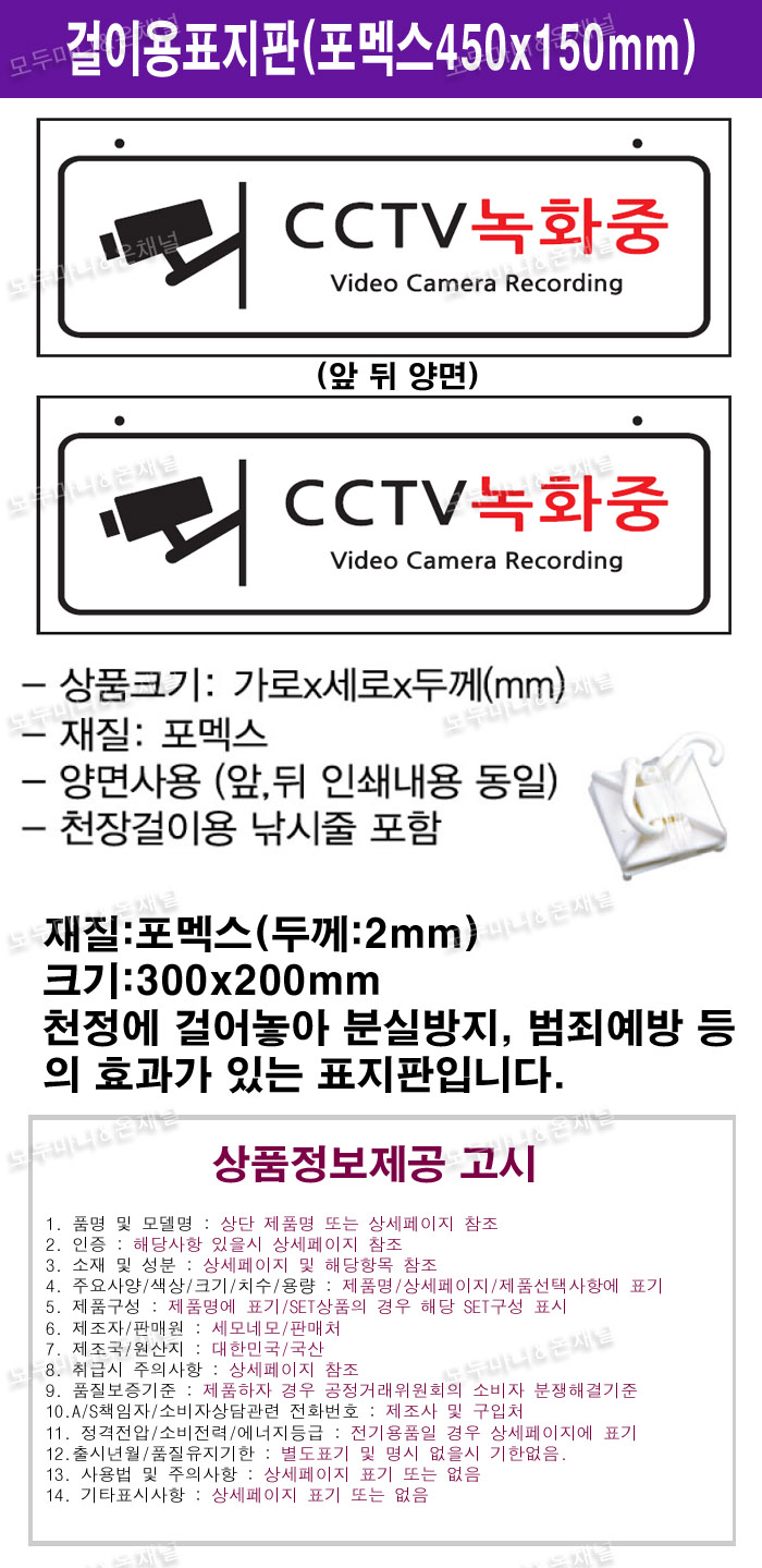 - 품명 및 모델명CCTV녹화중걸이용안내표지판(450x150mmx2t)