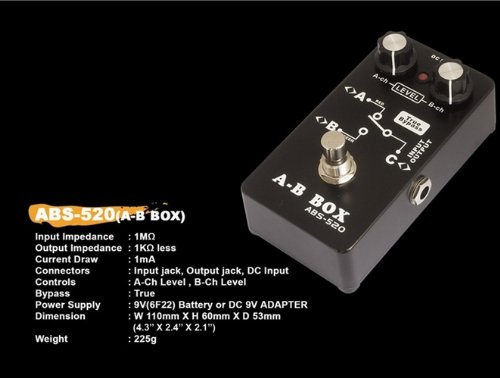 Studio : Kmise Publisher : Kmise Binding : Electronics Product Description 100% new Genuine Belcat A-B BOX ABS-520 Controls: Input jack, Output jack, DC Input Bypass: Buffer Power: 9V(6F22) Battery or DC 9v ADAPTER Connectors: Input Jack, Output Jack, DC input Dimensions: W 110m*H 60mm*D 53mm 4.3" x 2.4" x 2.1" Weight: 225g 0