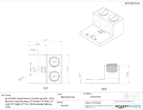 Burndy K2A26U Universal Terminal, 2 Conductor lugs, 14 Str. - 2/0 Str. Aluminum or Copper Wire Range, 1/4" Stud Hole, 1.25" Width, 1.47" Length, 0.79" Height, 0.19" Thick, 120lb Recommended Tightening Torque