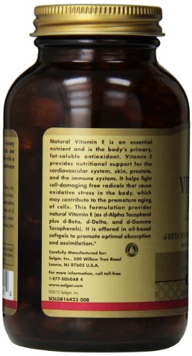-. Feature : Helps fight cell-damaging free radicals that cause oxidative stress in the body, which may contribute to the premature aging of cells / Natural vitamin E (as D-alpha tocopherol plus D-beta, D-delta and D-gamma tocopherols) / Oil-based softgel to promote optimal absorption and assimilation