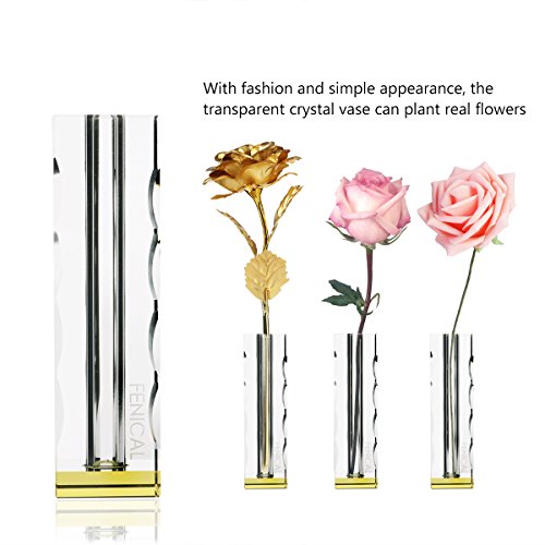 An elegant, crystal-clear vase is included. The perfect size and shape to hold a single flower, this vase is the ideal way to display the golden rose.
