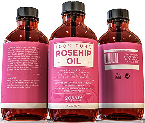 -. Feature : 100% ORGANIC ROSEHIP OIL: goPure Naturals brings you The purest Organic Rosehip Oil on the Market. / ROSEHIP OIL BENEFITS: Our Rosehip is Cold Pressed Therefore it is a Light Honey Color, not dark red-orange. Reduced the Appearance of Scars and Stretch Marks, Deeply Hydrate Dry Skin and Reduce the Appearance of Wrinkles and Fine Lines / HUGE AMBER BOTTLE: Large 4 oz Size with Dropper Included is Larger than Most Rosehip Oils on Amazon! / 3 MONTH MONEY BACK MANUFACTURER GUARANTEE: We want you to be 100% Satisfied! If you are not 100% Blown Away by our Rosehip Oil, just contact us for a full refund!