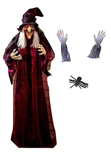 -. Feature : Halloween House Decor Kit 71 Hanging Animated Talking Witch, Zombie Arm Lawn Stakes, Spider / Hanging Witch is 71 inches tall. Features sound or touch sayings, noises red flashing eyes poseable arms / Halloween Zombie Arms attached to yard stakes are pale, dead flesh appearance. 14.5 inches long / Spider's body is 5 inches long with 4 inches long legs. Made of plastic. / Witch Best indoors or on a covered porch; not built to withstand harsh weather. Scary Halloween Decorations