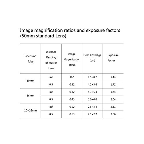 Macro extension tube can be used alone or in superimposed,When using the extension tubes alone (10 mm or 16 mm) or combination (10mm+16mm=26mm), the focal length of lens should be greater than the length (10mm 16mm or 26mm ) of the tube