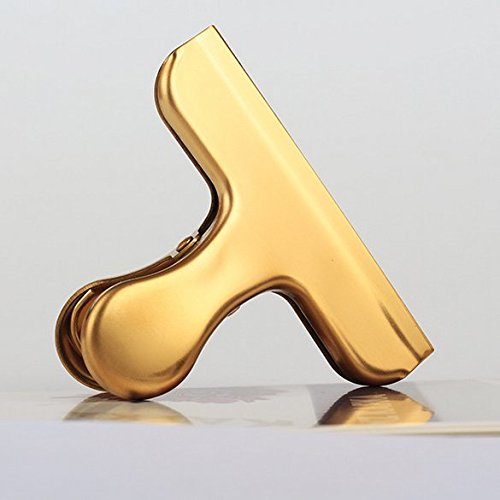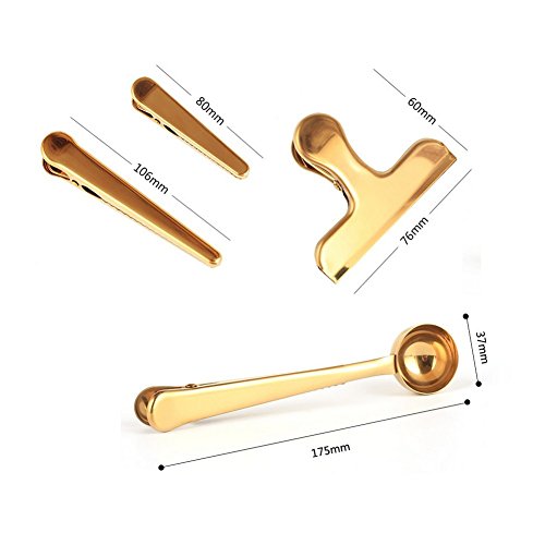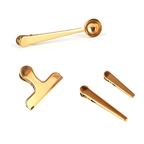 Chris.W Brass Tone Clips Set, Coffee Scoop Spoon with Bag Seal Clip, Bulldog Clip, Alligator Clips - Great for Kitchen and Office, Set of 4 Assorted Size(Gold)