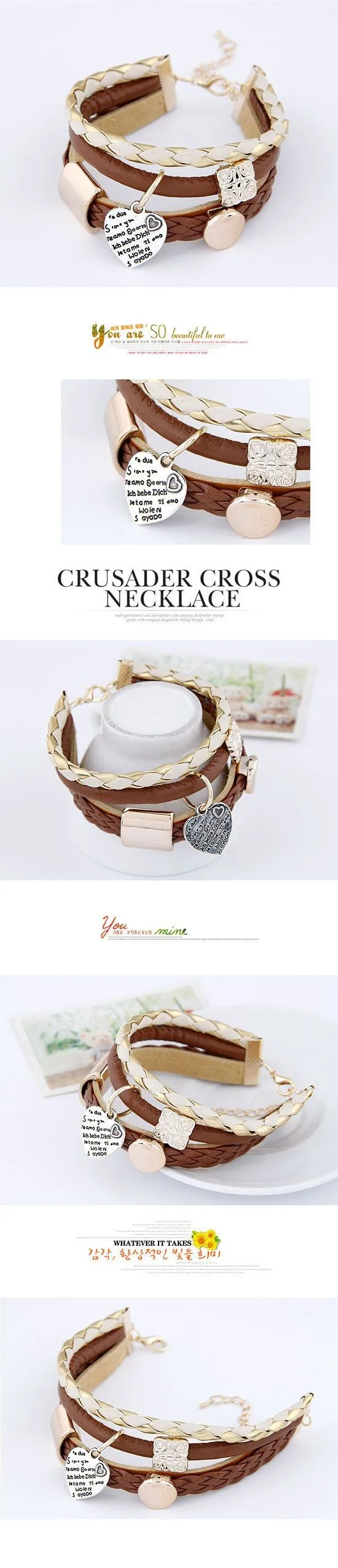 F&U New Fashion Lady Women's Stylish Jewelry Brown Leather Gold Metal Heart Bracelet