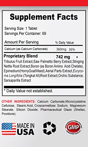 -. Feature : TESTOSTERONE BOOSTER 742: We are proud to introduce our new Custom Formula that is comprised from the top ingredients available on the market such as Calcium 360mg and PROPRIETARY BLEND 742mg that includes - Tribulus Fruit Extract, Saw Palmetto Berry Extract, Stinging Nettle Root Extract, Boron, Epimedium, Aerial Parts Extract, Eurycoma Longifolia Root Extract, Orchic Substance, Sarsaparilla Extract. / TESTOSTERONE BENEFITS: When Testosterone is low in men a Diatery Supplement will improve your General Health. Enjoy full benefits that include - Increased sexual drive, Improves sexual performance, Increases sperm count, Fights depression, Fights irritability, Improves ability to concentrate and Improves bone density. Lastly, it's also important to make lifestyle changes such as efforts to lose excess weight and exercise. / SAW PALMETTO BENEFITS: Saw palmetto is a remarkable herb for both men and women and is used by natural health practitioners to treat a variety of ailments such as testicular inflammation, urinary tract inflammation, coughs and respiratory congestion. It is also used to strengthen the thyroid gland, balance the metabolism, stimulate appetite and aid digestion. / NETTLE ROOT and EURYCOMA LONGIFOLIA BENEFITS: Nettle Root is historically used for joint pain, help the body rid itself of excess water and relieve symptoms of an enlarged prostate gland. Eurycoma Longifolia is used to stimulate libido, promote semen quality, and even support muscle gain. These effects have largely been attributed to increases in testosterone. / OUR GUARANTEE: (6 Bottles - 414 Tablets) Our product is proudly Made in USA at FDA approved facility and followed by strict GMP guidelines. Your Satisfaction Is Important To Us. 30 Days Money Back Guaranteed!