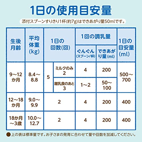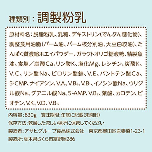 ●使用上の注意:●粉ミルクに水滴が入ると固結することがありますので、ぬれたスプーンは使用しないでください。 ●開缶後は、湿気や虫、ホコリや髪の毛などが入らないようにきちんとフタをして乾燥した涼しい清潔な場所に保管し、冷蔵庫での保管は避けてください。 ●開缶後はなるべく早く(30日以内に)お使いください。 ●電子レンジでのミルクの加熱は避けてください。