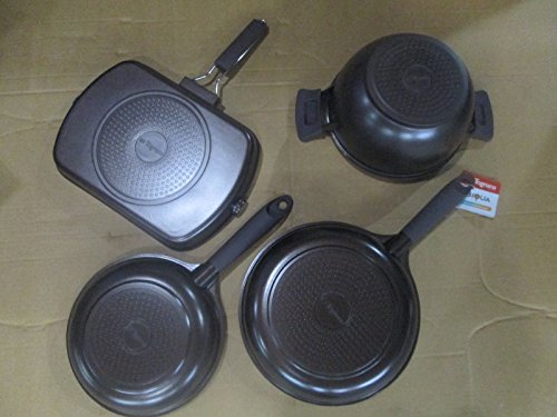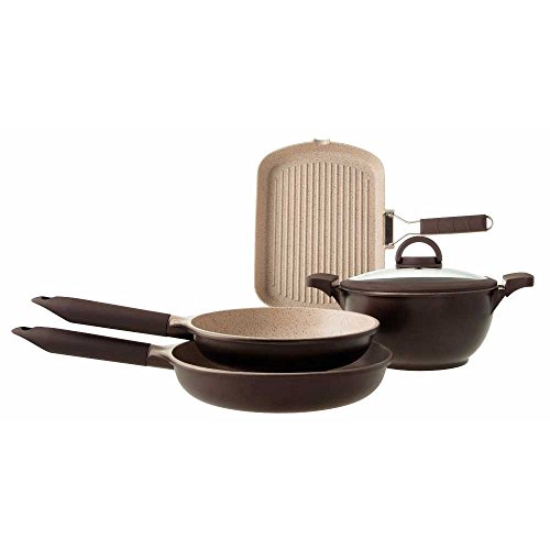 -. Feature : Tongana is a famous Italian manufacturer since year 1775 with thousands of employees making high quality ceramic tableware and cookware products. Their famous dinner plates are selling on Amazon at over $100 for six dinner plates because they are good. They have a reputation of making high quality and stylish cookware selling thought out the world but mainly in Europe. / Coated with the best and most durable German 5 layers Weilburger 3rd generation CK3+ Ceramic nonstick finish. They selected the German coating because it outperformed the Italian own coating by a big margin. This coating is the best of best and 10 times more durable than Teflon and are better than most cheap imitation. This cookware's coating can last well over 10 years without wearing off and remain non-stick. / Elegant Italian design and craftsmanship with peach color marble coating finish inside, maroon color exterior and attractive soft silicone covered handles. Inductive Cooktop Ready with inductive iron disc on the bottom! This cookware set is coated with a non-toxic and really tough lead free coating. / Non-toxic coating, 100% PTFE and PFOA free, Safeguard for health !!! Complied with Food Grade Standards of FDA, LFGB, DGCCRF, ROHS, and REACH / Set consist of a 11.2" (28cm) fry pan, 9.6" (24cm) fry pan, a 9.6" (24cm) soup pot, and a 24x34cm (9.6"x13.6") grill pan, one 24cm temper proof glass lids with silicone seal.