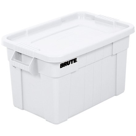 The Rubbermaid Commercial 9S31 Brute tote is white, comes with a snap-on lid, and can be used for storage and transport. The tote is suitable for use in a food service facility. It is made of HDPE (high-density polyethylene), which resists wear and certain chemicals and can be recycled. The tote is ribbed for strength. Handles facilitate lifting and carrying. Drain holes in the handles help prevent water from collecting. Rounded corners enable the box to be wiped clean. Two or more totes can be stacked for storage. The tote has a 20-gallon capacity and measures 27-7/8 x 17-3/8 x 15-1/8 inches (L x W x H). (L is length, the horizontal distance from left to right; W is width, the horizontal distance from front to back; H is height, the vertical distance from lowest to highest point.) It meets National Sanitation Foundation/American National Standards Institute (NSF/ANSI) Standard 2 for use in food handling and processing.