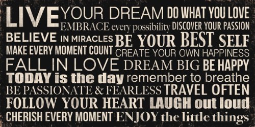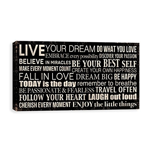 Live Your Dream in Black is a motivation and inspirational piece. Available in 24"x12" printed canvas format with gallery wrapped edges that is ready to hang. This format offers a clean and classic profile while accentuating the art with an authentic canvas texture for a fine art look. Our canvas format is a classic wall decor option for today's modern home.Feature
