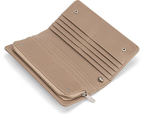 Bifold wallet with snap closure and large zipper coin pocket. INTERIOR: 14 card slots, 2 bill compartments. Detachable wristlet.