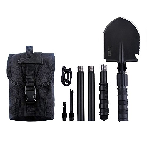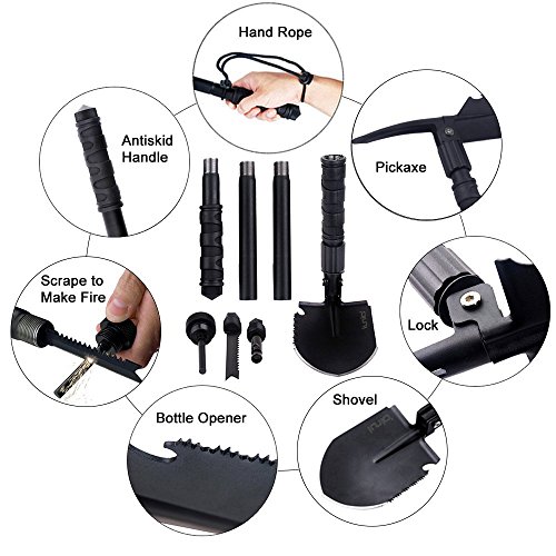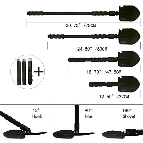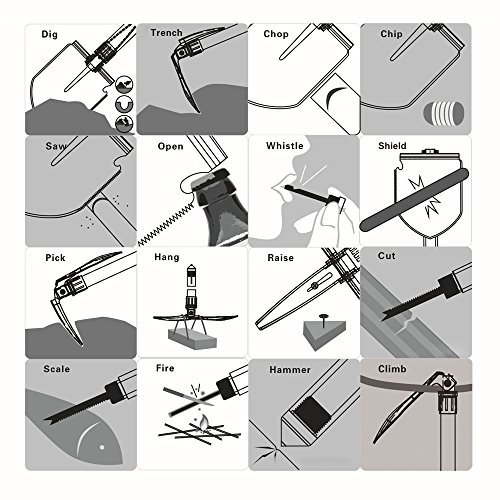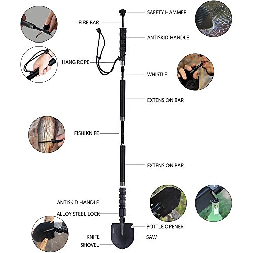 Extension Bars - Features a regular shovel doesn't even have, all in this convenient folding shovel: Shovel Board, Saw, Bottle Opener, Nail Extractor, Hoe, Scales Knife, Hunting Knife, Emergency Whistle, Fire Bar, Hammer. Extension Bar included: Except being an ordinary folding shovel, you can extend this military shovel to a comfortable size for standing up digging. You can choose the length of shovel by adding less or more extensions according to your height.