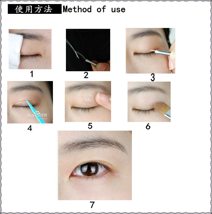注意:有的亲会说双眼皮贴过一会儿就不太粘了,那一定是你使用方法没有掌握好。洁面后,先将脸擦干,在面部未使用任何护肤品和彩 妆的情况下,先将双眼皮贴按下面介绍中的方法贴于眼部,然后再用护肤品和彩妆,这样就不容易掉了。双眼皮贴防水,但是不防 油的哦,如果您是大油田的皮肤,记得要用吸油纸将眼部肌肤上的油份吸干净。